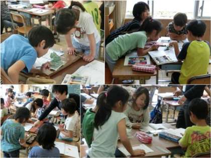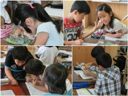 キャベツの葉を食べて、モンシロチョウの幼虫が大きくなってきました。もう緑色をしています。ルーペも使ってしっかり観察しました。