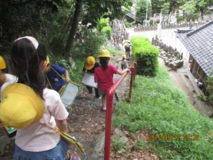 2年生は校区探検にでかけ、自分のふるさとの良さを視覚、聴覚、触覚などの五感をつかって体験的に調べる学習をしました。