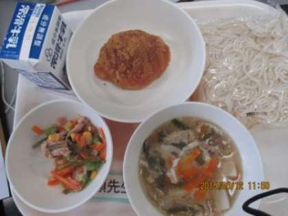 ソフト麺、牛乳、、和風かけ汁、枝豆ととにんじんのサラダ、そして人気のきなこ揚げパン、