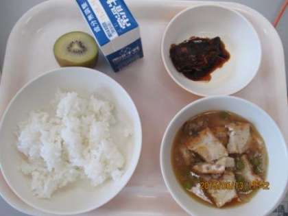 ご飯、牛乳、なまあげのそぼろに、いわしの八丁味噌煮、キウィフルーツ