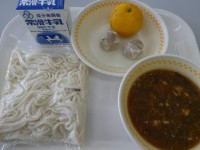 ソフト麺 牛乳、卵かけ汁、野菜入りつくね、大豆のアーモンドがらめ