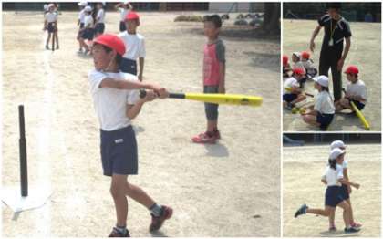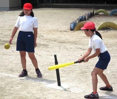 ベースボール型のニュースポーツ「プレルボール」を行っていました。