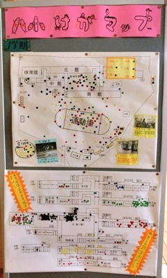 保護者会のときに、保健室前に掲示してありましたので、見られた方もみえると思います。一学期にけがが多く起こったところは、このようにしてみるとよく分かりますね。では、どんなことに注意すれば良いのでしょうか。このマップがヒントになりますね。よく考えてみましょう。