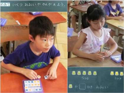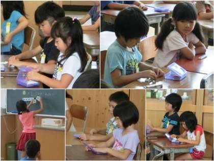 黒板に緑のカエルと黄色のカエルの絵がはってあります。