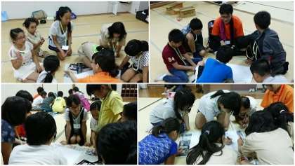 初日は、グループでカレーを作り、火起こし体験をしました。なかなか火がおこらず苦労しましたね。その後、グループで団旗の制作をしました。この日始めて会った子どもたちですが、仲良く制作していました。