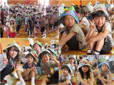 自分たちで作った兜をかぶり、こいのぼり集会を行いました。