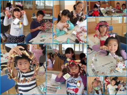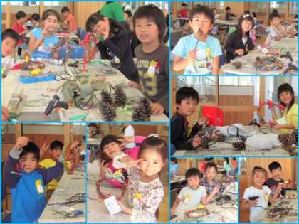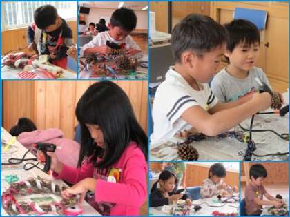 アサガオのつるにどんぐりや松ぼっくりをつけて、リースをつくりました。いろいろ工夫を凝らして上手にできあがりました。