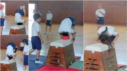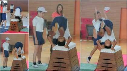 体育館で台上前転をしました。