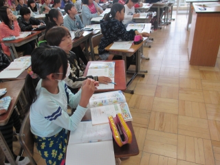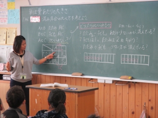 畳と人数の関係でどちらが混んでいるかを調べるという学習から単位当たりの数量について学んでいました。みんな興味深かそうに取り組んでいました。