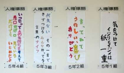 今日の朝の集会で発表した人権標語がもう掲示してありました。すばらしい標語が並んでいますね。みんなで協力して実践できるようにしていきましょう。