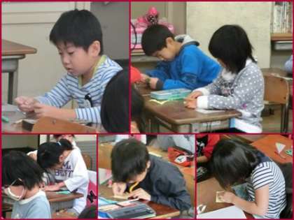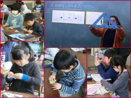 紙を折って作った四角形が長方形かどうか調べます。三角定規の直角を使って、四隅の角度が直角になっているか確かめました。きちんとなっていましたね。
