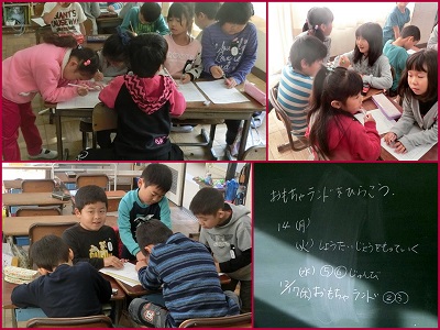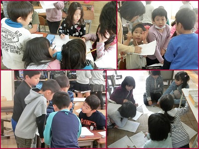 17日(木)に1年生を招待しておもちゃランドを開きます。そのための準備をグループで行っていました。去年は招待された2年生。去年のことを思い出して、どのようにすると1年生が喜ぶのか考えていましたね。