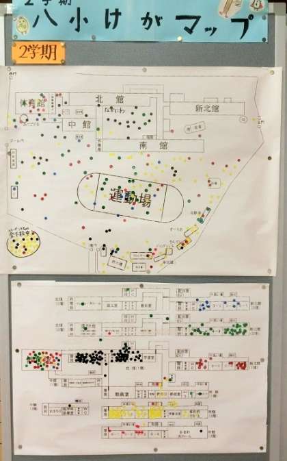 シールの色が学年を表しています。1年生が黄色、2年生が黒、3年生が茶色、4年生が緑、5年生が青、6年生が赤です。けがが多いのはどの学年か、一目でわかりますね。