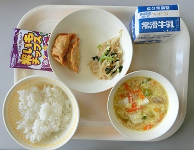 ごはん、中華コーンスープ、揚げ餃子(2個)