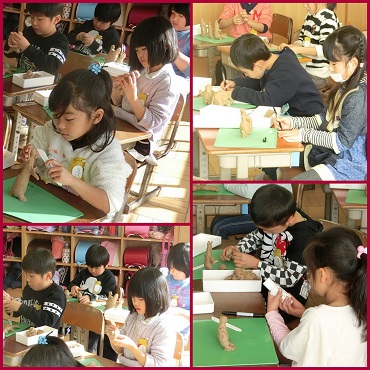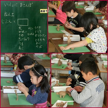 粘土で、自分と一緒に散歩する人や動物などを考えて作ります。