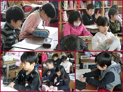 教科書をコピーして冊子にしたものをみんな持っています。線を引いたり、書き込みをしたりと学習の後がわかります。一人一人が違っていますね。モチモチの木のマイブックができあがりました。
