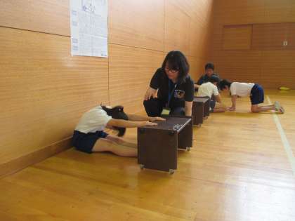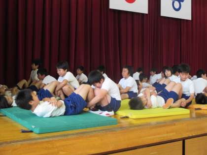今日はあいにくの雨で、予定されていた体力テストは体育館の種目のみ実施となりました。体育館では、長座体前屈、上体起こし、反復横跳び、シャトルランを行います。自分のベスト記録を目指し、5年生が一生懸命に取り組んでいました。
