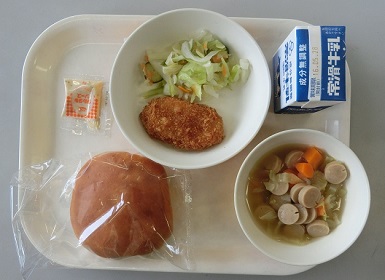 サンドイッチパンズ、野菜のスープ煮、エビかつ