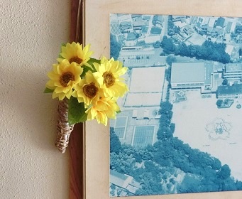 さて、いつも玄関のパネルに飾っていただいている飾りが変わりました。夏らしい花になりましたね。とても素敵です。いつもありがとうございます。