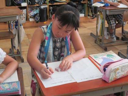 先日、3年生では総合的な学習の時間で、自分たちが考えた八幡小のさまざまな疑問をインタビューしました。今日はそのまとめをしていました。新しくいろいろなことを知りましたね。