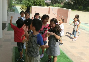 運動場でシャボン玉を行っていた1年生。