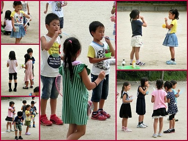 団扇の骨だけのものを使ってシャボン玉をつくると、大きなシャボン玉ができますね。みんな楽しそうでした。写真では、シャボン玉が写らないのが残念です。