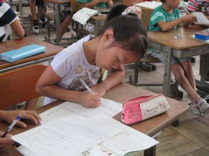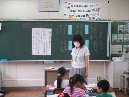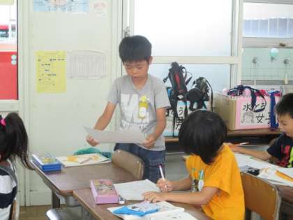教科書や担任の先生のお手本も参考にして、一人一人がじっくりと文章を考えてワークシートに書いていました。