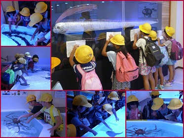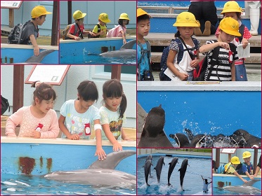 イルカショウーを見て、海の生き物とふれあいました。どんな感触がしたかな。