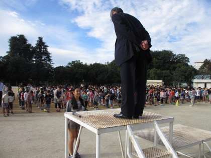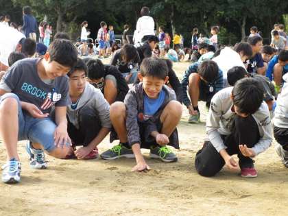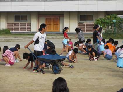 元気に朝のあいさつをした後、すもう大会に向けてみんなで運動場の石を拾いました。