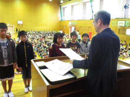 今日の朝会は、通級指導の先生のお話と、たくさんの表彰がありました。
