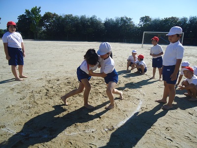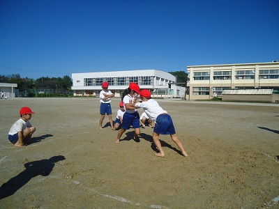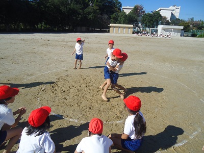 2年生も6年生の隣ですもうの練習です。2年生は作戦もなく全力の取り組みです。足かけやつり上げが禁止の分,重量の差があってもよい勝負になると聞きました。確かに2年生でも大迫力の取り組みでした。