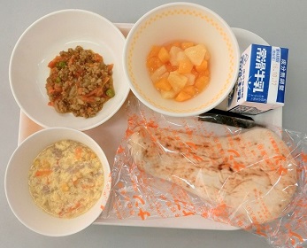 フルーツのゼリー和え、牛乳、コーヒー牛乳のもと