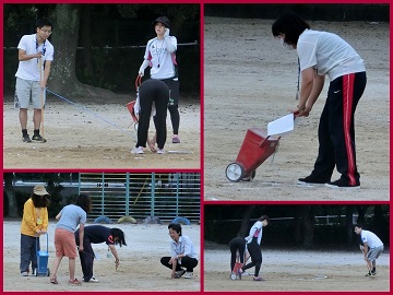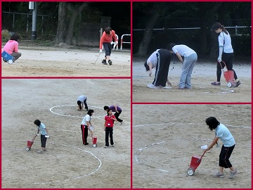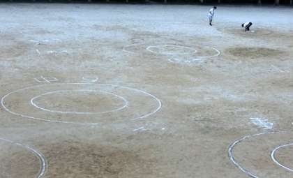 子どもたちが下校した後、先生たちですもう大会の準備をしました。運動場に円がたくさんできました。