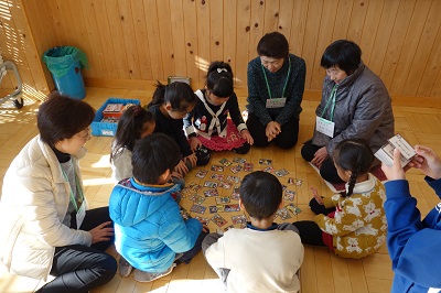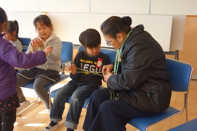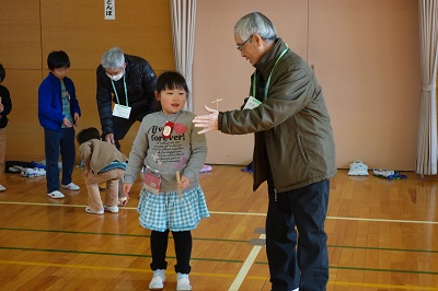 1年生がおじいさん,おばあさん方から昔の遊びを教えてもらいました。メンコ,おはじき,坊主めくり,かるた,あやとり,折り紙,はねつき,こま回し,竹とんぼといろんな遊びを楽しみました。今も昔も遊びは楽しいですね。