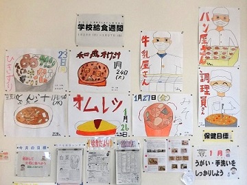 今日の児童集会で話があったように、来週は学校給食週間です。給食委員の児童が中心となって掲示物もつくってくれました。上手にできましたね。