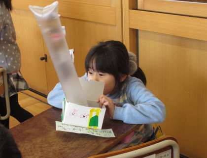 図工で作ってきた作品が完成しました。吹いて出てくるかどうか試しています。