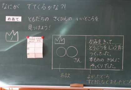 今日は友達の作品のよいところを見つける活動をします。自分の作品にはないよいところを見つけられるといいですね。