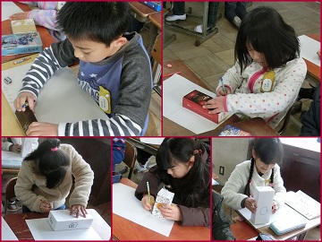 立体の面を用紙に写します。写していくと、どんな形が何枚あるかよくわかりますね。