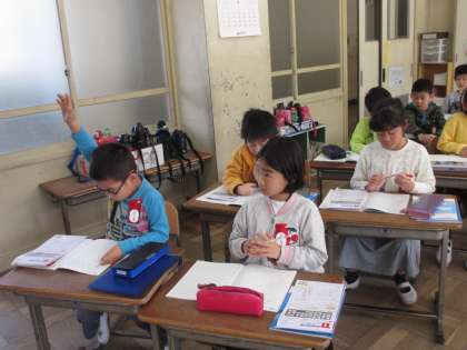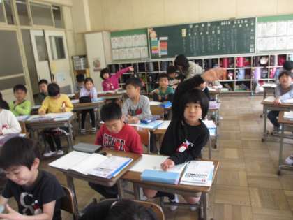 給食調べという問題で、表にまとめています。自分で考えて、できたら静かに手をあげていました。