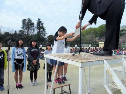 おはようございます。今日は本年度はじめての月曜朝会を行いました。全員で元気よくあいさつをしたあと、新しい学級委員、委員会委員長の任命を行いました。任命されたみなさんは、これからよろしくお願いします。