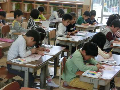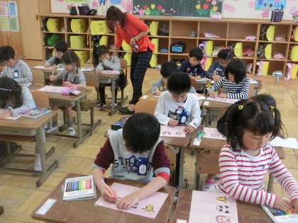 キリンやパンダに一生懸命色を塗って、自分の名刺を作りました。