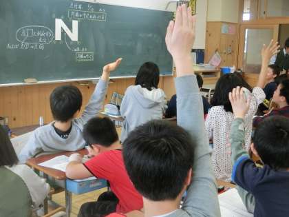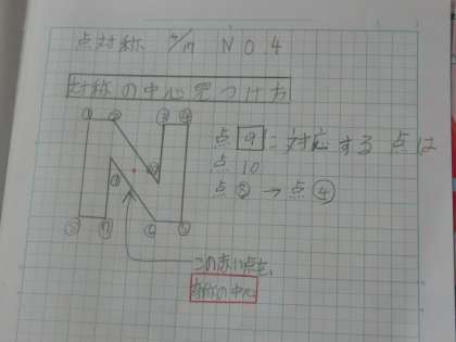 算数で、「点対称」の勉強をしました。線対称に比べて難しいと感じる児童もいると思いますが、近くの友だちと意見を交換しながら解決に向かっていました。友だちの意見を聞いたある児童の、「なるぼどなあ」というつぶやきが印象的でした。