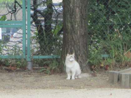 雨があがり、空も徐々に明るくなってきましたが、運動場はまだ水たまりがたくさん残っています。いつもならにぎやかな昼休みの運動場ですが、今日はとても運動場が静かですので、近所のネコがやってきて、不思議そうに運動場をながめていました。なんとものどかな光景でした。