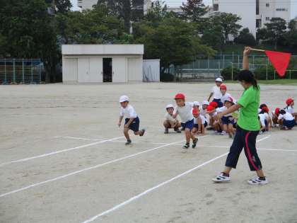 曇り空の下、1年生の体育でかけっこをしていました。タイムを計測していましたが、きっと4月よりもみんな速くなっているでしょうね。みんな、全速力でゴールをかけぬけていました。