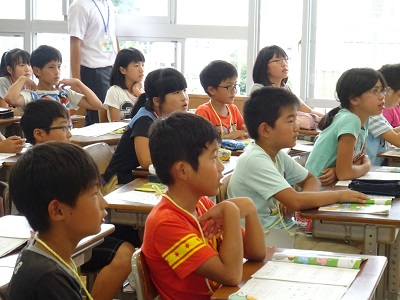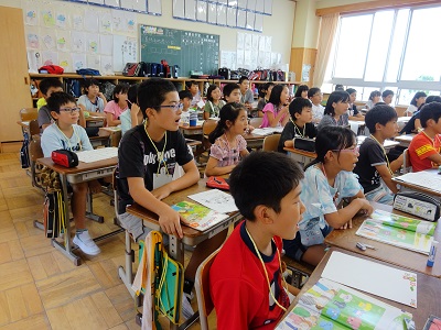2学期最初の外国語活動の授業です。今日は色の名前と,「どの色が好きですか?」「○○色が好きです。」という会話の学習をしていました。大きな声を出して学んでいましたね。