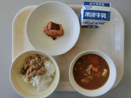 食欲の秋です。今日もおいしそうな給食ですね。ツナそぼろをごはんに混ぜて食べると、何杯でもお代わりがができそうです。今日もおいしくいただきましょう。