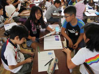 5年生の道徳です。「ブランコ乗りとピエロ」という読み物資料で、「相互理解・寛容」という道徳的価値についての授業です。、ピエロのサムに対する怒りがなぜなくなっていったのかをグループで話し合っていました。