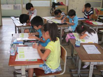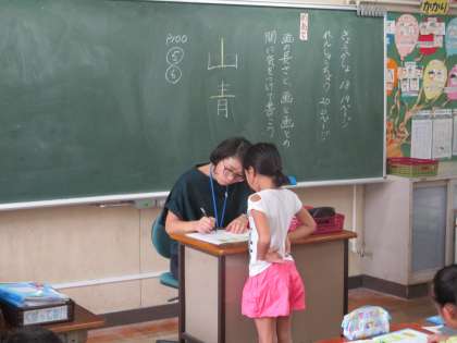 2年生の書写です。画の長さ、画と画の間のひろさに気をつけて書いていました。「山」や「青」などの文字です。めあてを意識して書くことができていますね。