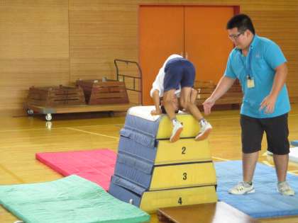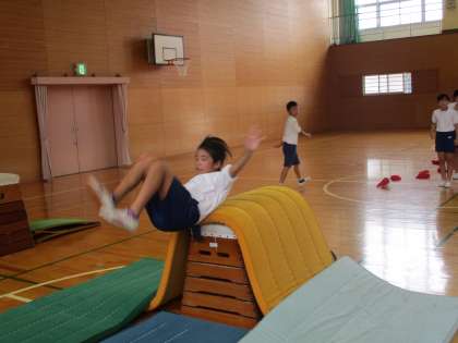 4年生の体育で、台上前転に取り組んでいました。マットでの前転のコツを生かせるといいのですが、跳び箱なので抵抗感がなかなかとれなくて苦労しますね。でも、先生に教えてもらうポイントを意識して繰り返し練習すれば、できるようになりますよ。