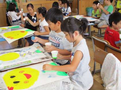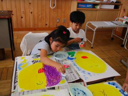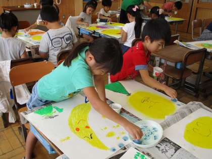 1年生の図工です。前回まで、クレパスを使って空のお月様の絵を描いてきましたが、今日はいよいよ背景の空に着色します。夜の空を完成させます。とても楽しそうにガーゼでとんとんと色をつけていました。